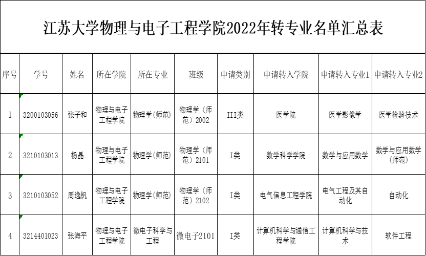 根据《一帆视频 本科生转专业实施办法》(江大校〔2018〕10号)、《关于做好2022年本科生转专业工作的通知》(江大教〔2022〕56号)等文件精神,经个人申报、学院审核,现将符合条件的同学公示如下: