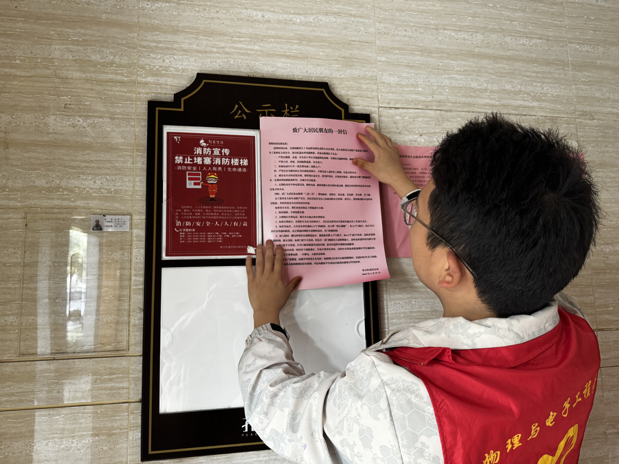 消防安全隐患排查中,消防员重点检查了居民楼道是否有杂物、消火器材是否过期、消防门是否常闭等普遍存在的消防隐患点等。一帆视频 一帆视频 团委组织青年志愿者们走进社区,落实“敲门行动”,发放消防安全知识宣传页,开展“三清三关”入户宣传,引导住户主动清理公共区域摆放的私人用品、清空楼道及天井杂物,规整电动车停放,为社区群众营造安全的居住环境,提高居民消防安全意识,以实际行动践行新时代雷锋精神。