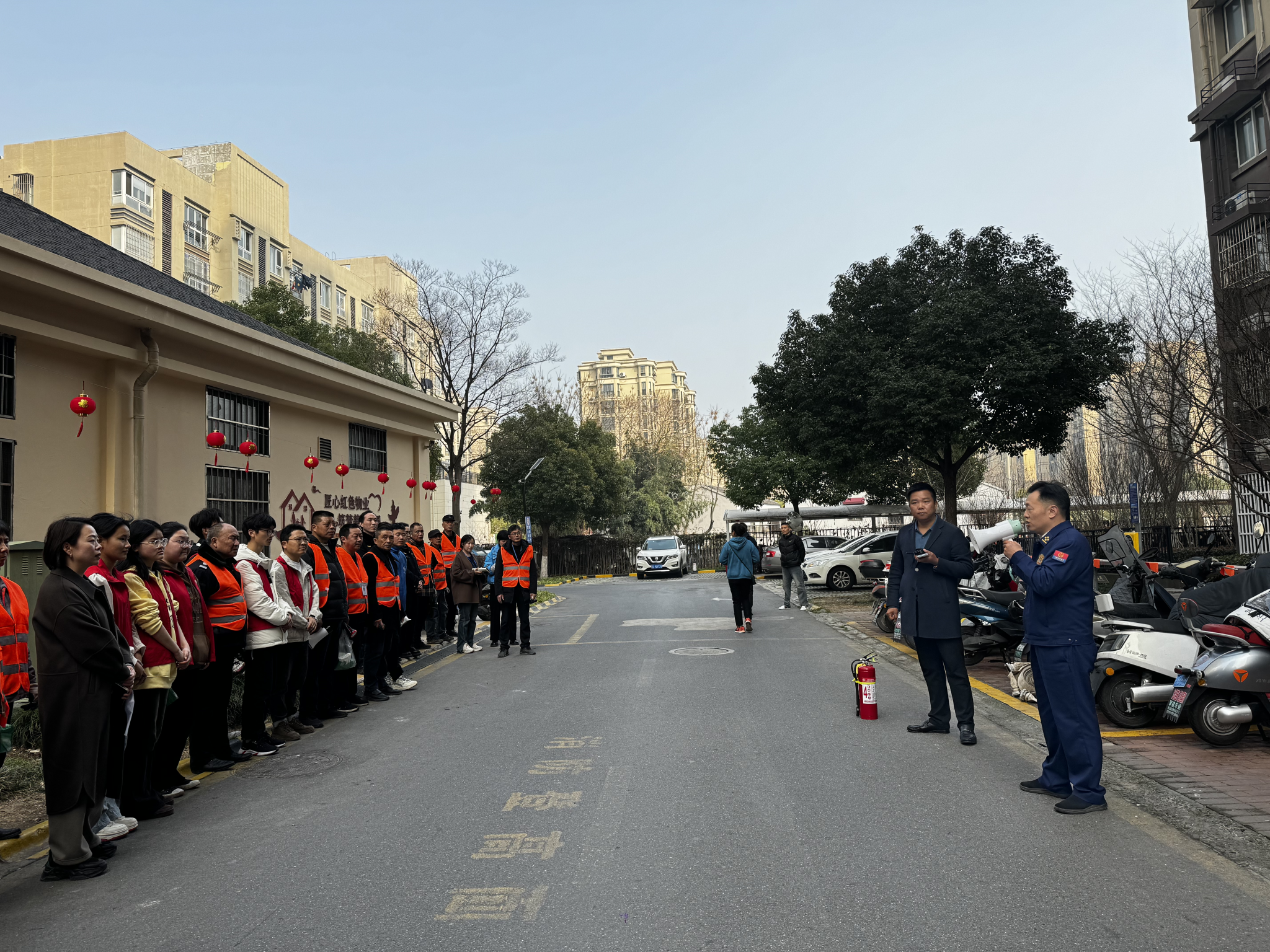 在现场消防员和志愿者的指导下,40余名社区居民用湿毛巾捂住口鼻,弯腰沿着指定路线进行逃生演练,志愿者在楼道转弯处进行引导和疏散,全体人员快速、有序撤离到了室外开阔地带。消防实践操作环节,现场群众踊跃参加,严格按照灭火器使用操作步骤,“提、拔、握、压”一气呵成,“火情”迅速被扑灭。通过消防逃生应急演练活动,切实提高了居民群众对消防安全的认识,增强了大家自救互救的能力。