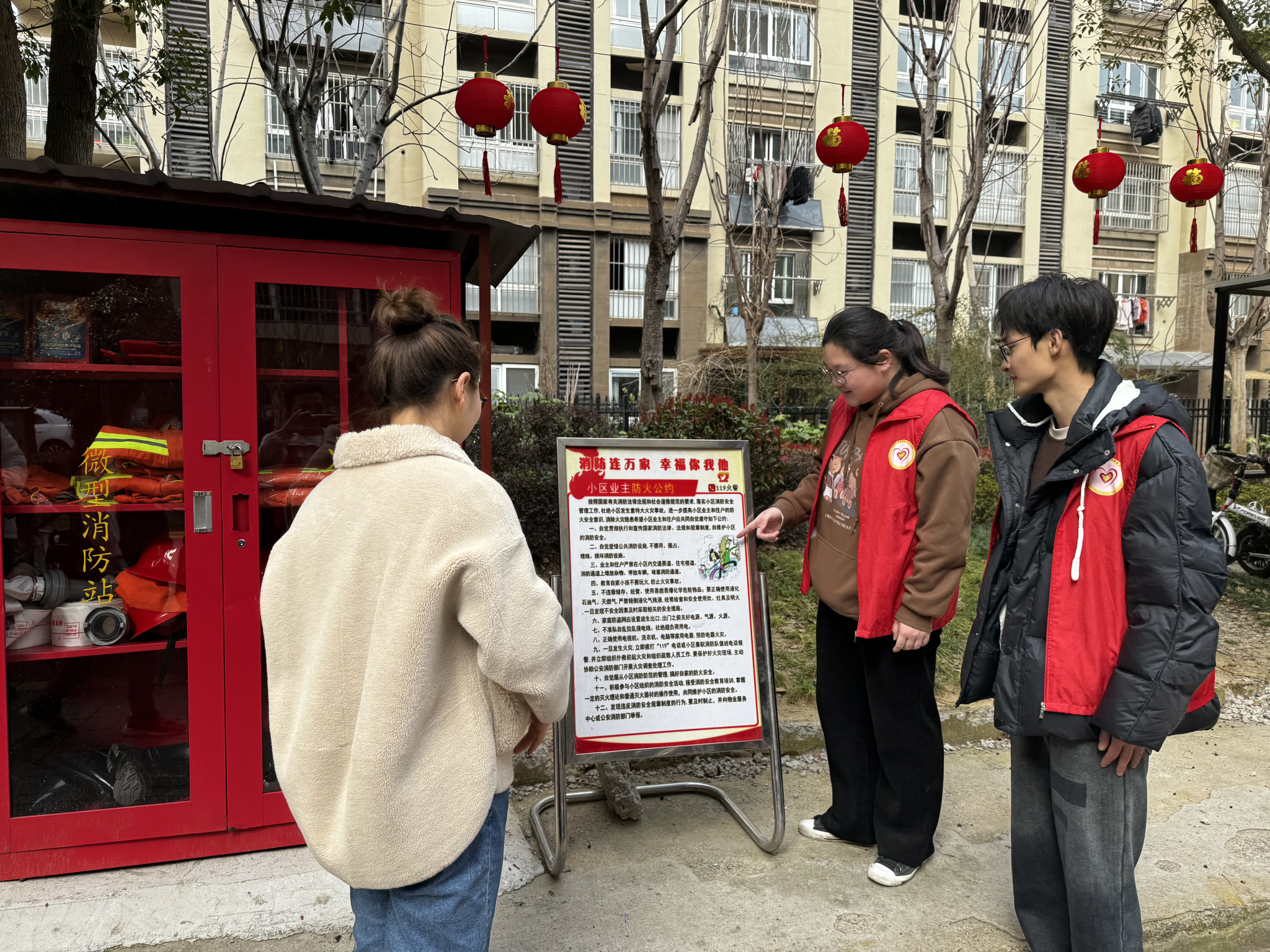 大学生志愿者集中学习收看《2024年春季火灾疏散逃生演练公开课》,学习了火灾的预防和应急处理、常见消防器材的及使用方法、电动车火灾警示教育等相关知识。为巩固宣讲学习成效,志愿者们进入社区向居民开展消防宣传,特别是电动车“三严禁”安全提示以及居家生活“三清三关”。