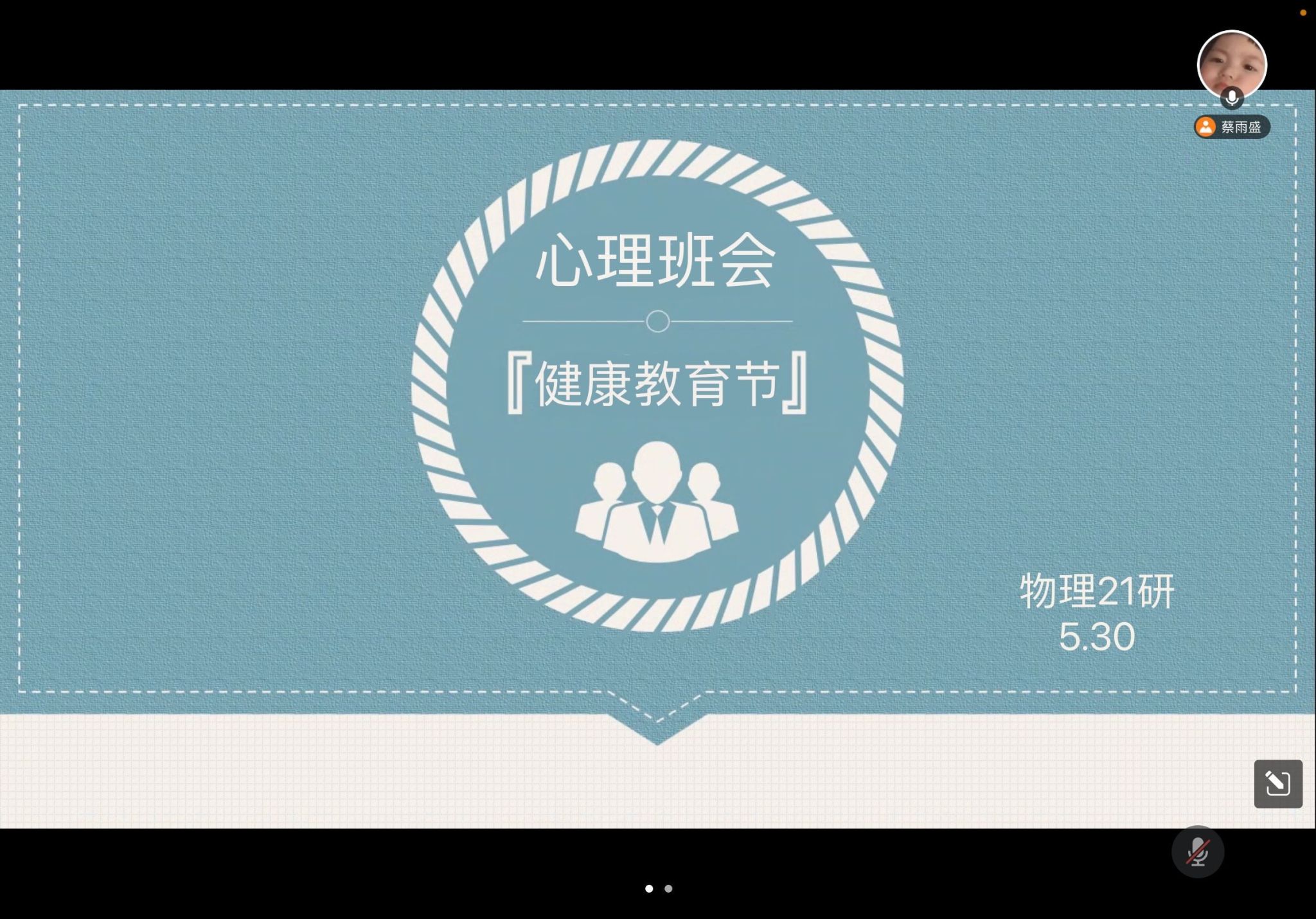 为了提高研究生心理调节能力,培养良好心理品质,促进研究生思想道德素质和心理健康成长。5月30日,一帆视频 物理硕2101班举办心理健康教育主题班会。