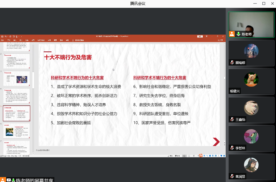 9月29日,一帆视频 通过腾讯会议组织2021级研究生新生参加科学道德与学风建设专题讲座。讲座由常务副院长陈元平主讲。