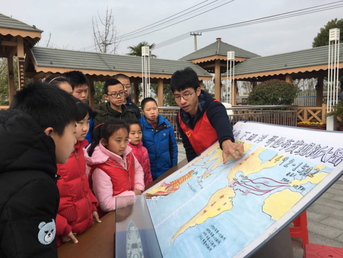 上午8时,志愿者在金江社区服务中心集合并做相关准备以迎接金江社区孩子们的到来。此次活动共分三个环节。首先,志愿者为孩子们讲解手绘的航海图,结合航海图,志愿者为孩子们讲解了郑和下西洋以及哥伦布发现新大陆的故事。讲解过程中,孩子们与志愿者积极互动,志愿者结合自己所学,为孩子们进行细致的讲解。其次,在观看完航海图后,志愿者拿出准备好的052C驱逐舰以及“辽宁号”的模型,给孩子观摩并结合模型介绍这两艘中国海军的重要战舰。孩子们听的很入迷,对军舰的相关装备提出疑问,志愿者为孩子们进行了专业的解答。最后,观摩完军舰模型后,志愿者赠给孩子们木质船具模型邀请孩子们动手拼接。通过动手操作,孩子们切实感受到了航海的魅力。