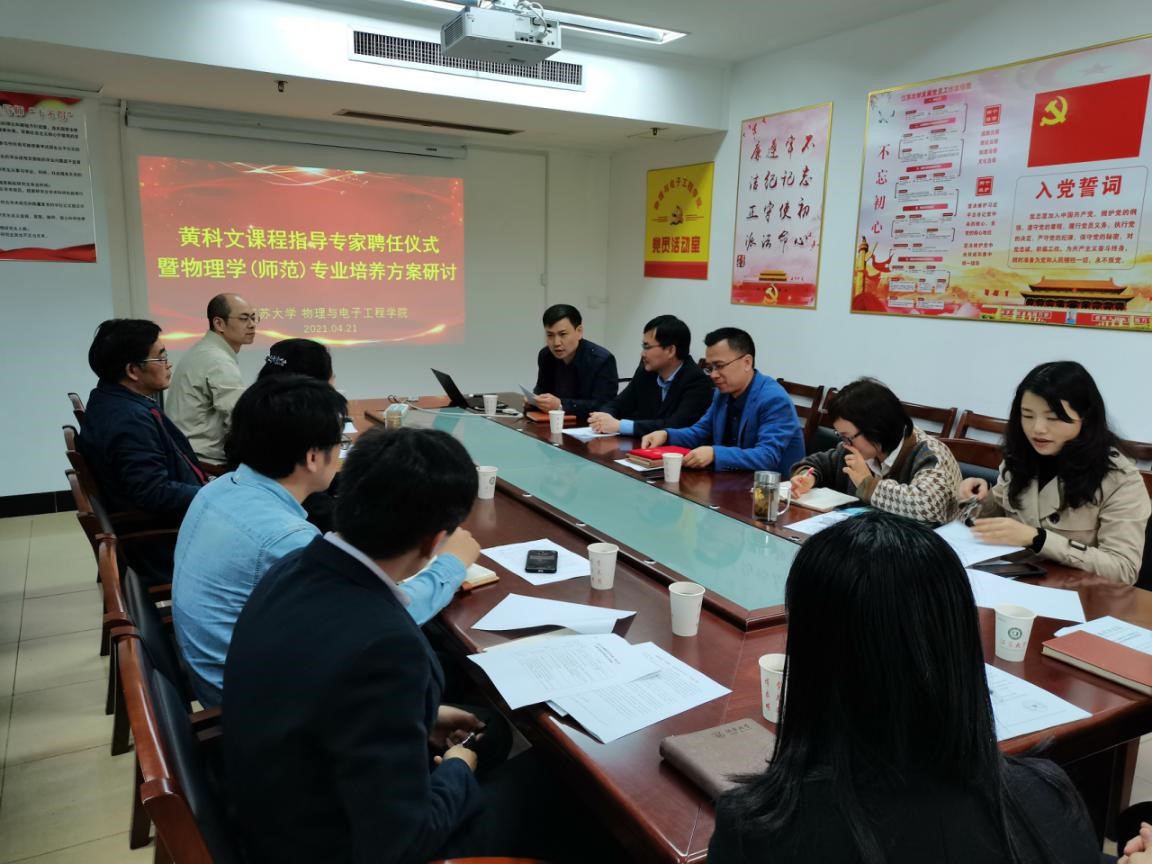 421日下午,黄科文课程指导专家聘任仪式及物理学(师范)专业培养方案研讨会在301会议室举行。学院党委书记潘金彪、常务副院长陈元平、各系部负责人,以及参与培养方案修订的相关老师参加了此次会议,会议由院党委书记潘金彪主持。